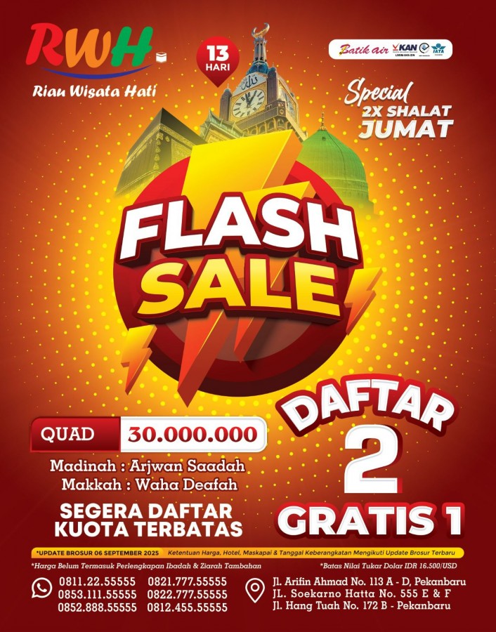UMRAH FLASH SALE 2 KALI SHOLAT JUM'AT KEB. 01 OKTOBER 2025 // DAFTAR 2 FREEE 1 // TANPA PERLENGKAPAN